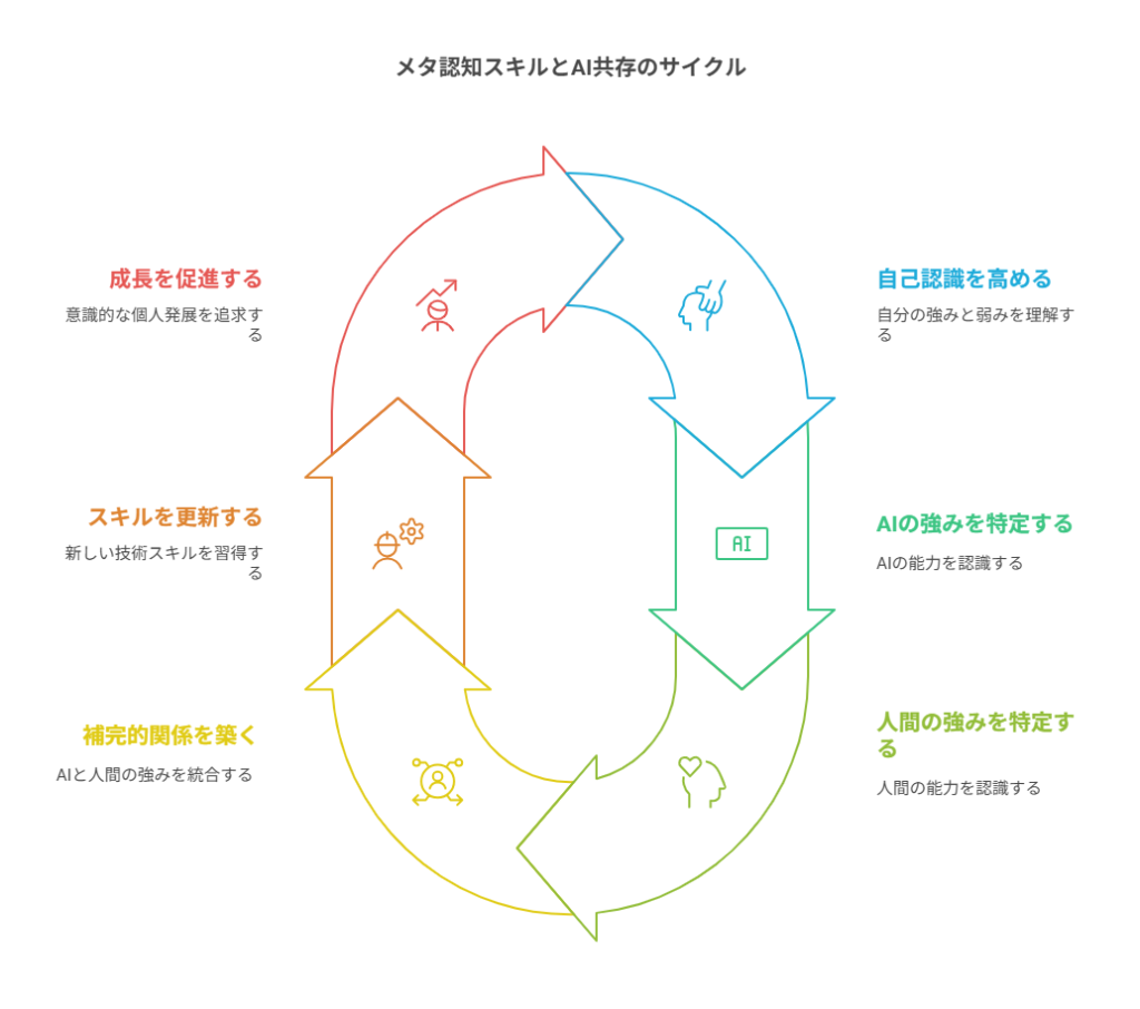 今後、AIとの共存が進む中で、私たちの役割は変わりますが、それは決してマイナスの変化ではありません。むしろ、技術を活用することで、私たちがより充実した、クリエイティブな生活を送ることができるようになるのです。そのためには、メタ認知スキルを高め、AIとの関係を補完的かつ協力的に築いていくことが重要です。