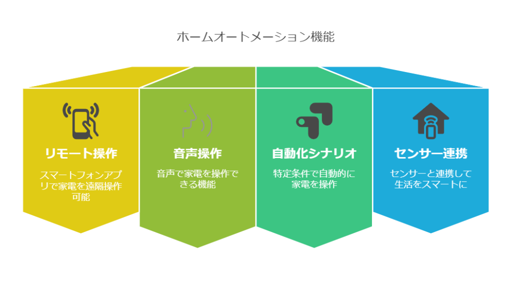 1. 自動化シナリオ: 特定の時間や条件に応じて自動で家電を操作するシナリオを設定できます。例えば、朝の7時に自動でカーテンを開ける設定などが可能です。
